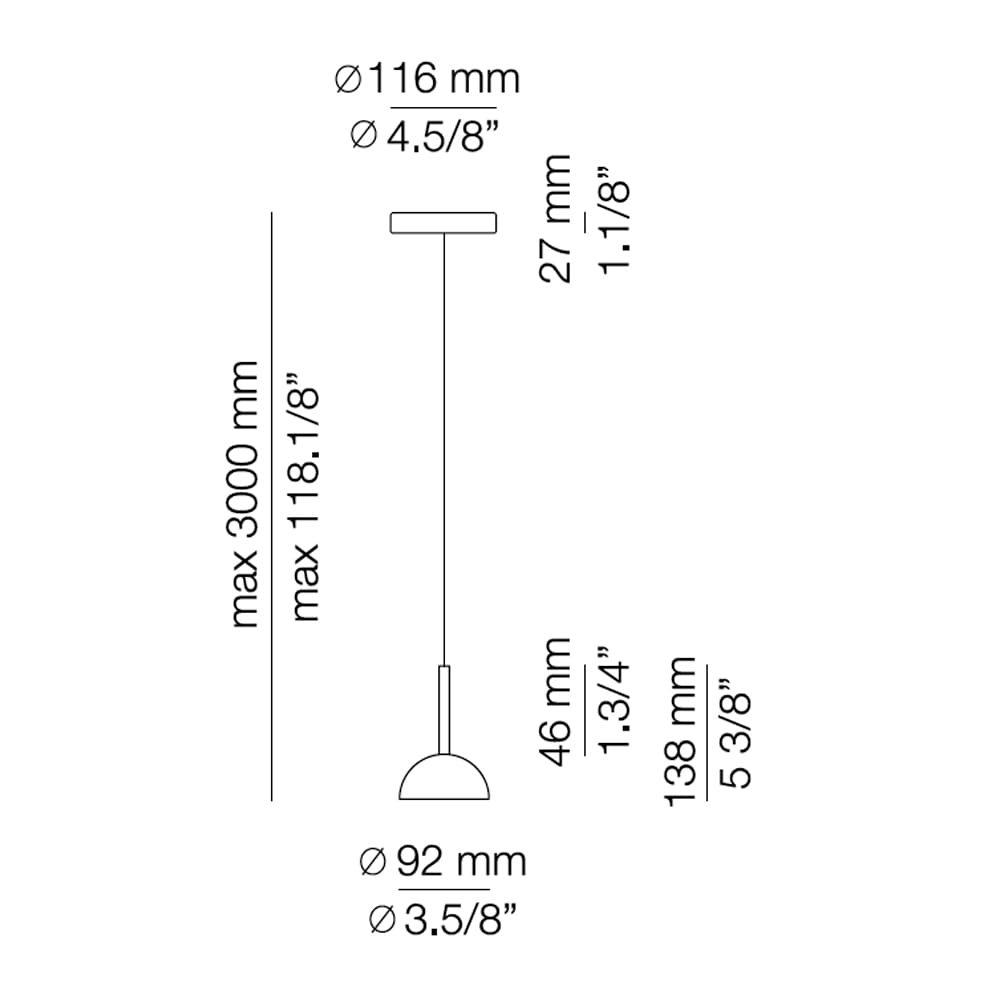 Light source: LED 6,2W 2700K – Ang. 70º – >90 CRI / 350mA – 100V – 240V / 725 lumens – Not dimmable. Includes: 1 canopy 113534XX0 – 1 T-3934 con cavo – 1 driver 671000038. Dimensions: lamp ⌀92mm base ⌀116mm H max 300mm