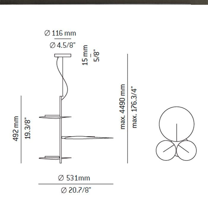 Light source: LED 3x 10W 2700K – Ang. 120º CRI90 230V – Typ 3×730 lumens -dimmable Triac – Dimensions: ø. 53,6 cm – H. 52,5 cm