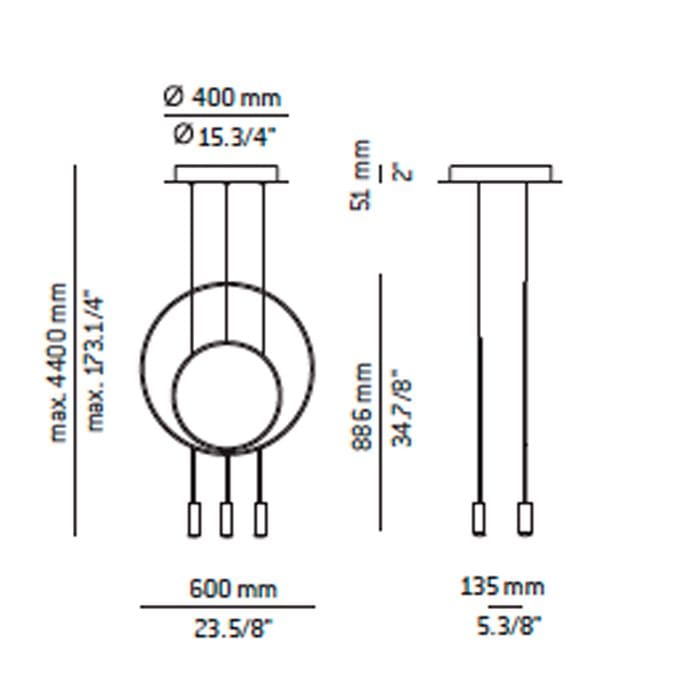 Light source: LED 2x 6,1W 3000K Typ 578 lumens – Ang. 120º CRI90 – 350mA 230V – Includes 1x T-3635C e 1x T-3636C -2x driver Includesd – dimmable Triac – Dimensions: ø. 60 cm – P. 13,5 H. 86,4 cm