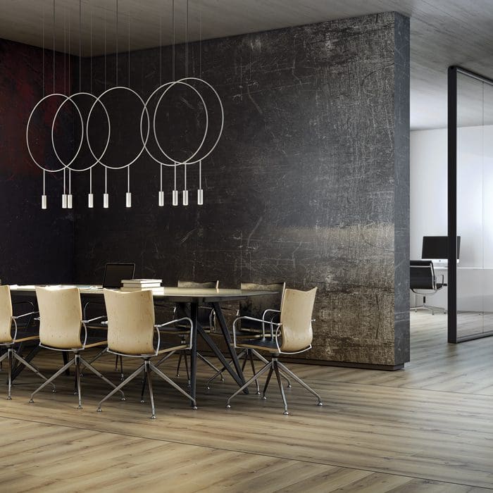 Revolta is a collection of lamps designed by Nahtrang Studio and produced by the Estiluz brand. Open circles drawn in the air or fabric panel frames to soften the sound. The hanging cylinders have aluminum heads and acrylic diffusers. Revolta offers a unique and decorative solution to attenuate ambient noise with fabric-covered sound-absorbing foam acoustic panels. Revolta can also be used to divide large spaces into discrete areas.