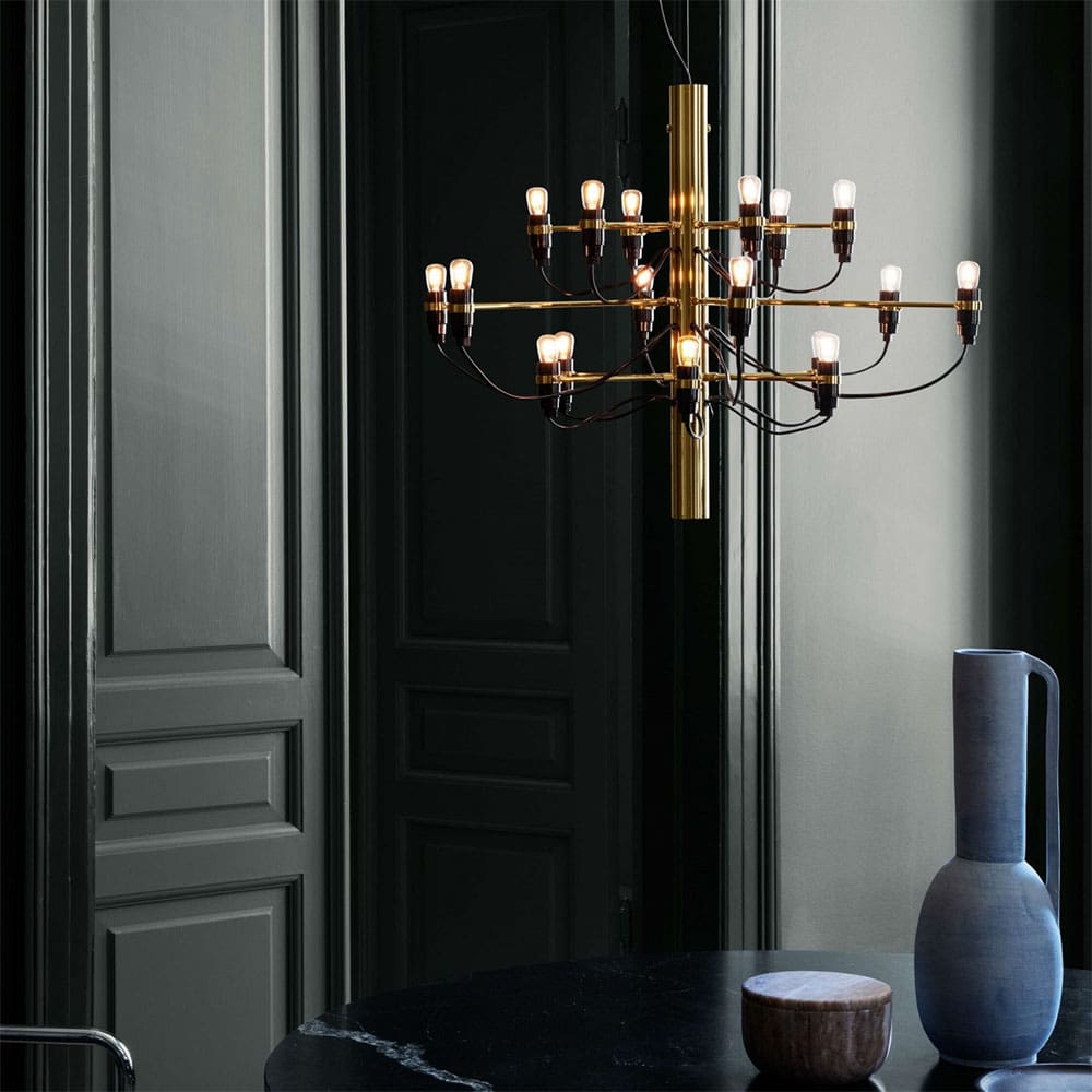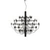 2097/18 by Flos, designed by Gino Sarfatti in 1958, is a suspension lamp that reinterprets the classic chandelier with a modern, industrial aesthetic. Featuring 18 finely crafted brass arms and a central iron structure, available in chrome, black, or gold finishes, this pendant light is an icon of contemporary design. The ceiling attachment is complemented by a steel canopy, ensuring stability and refined elegance. Ideal for sophisticated and elegant interiors, the 2097/18 provides diffused and enveloping light, available with transparent or frosted bulbs that enhance the interplay of reflections on the metallic structure. A timeless piece that enhances any space, from classic to modern, embodying the prestigious Flos style.