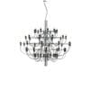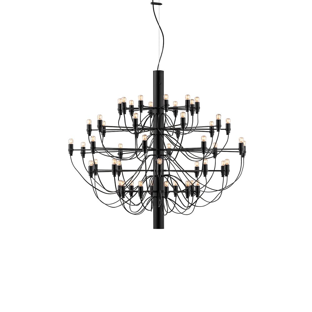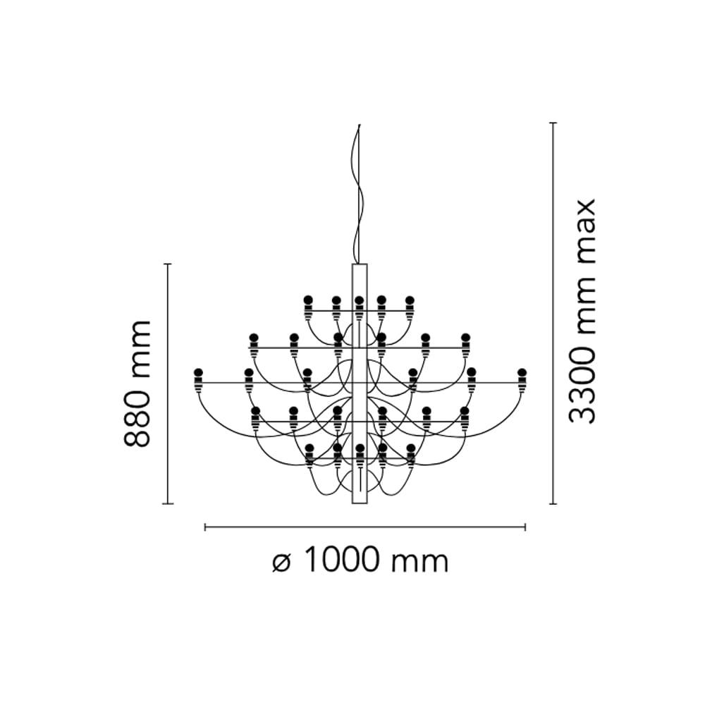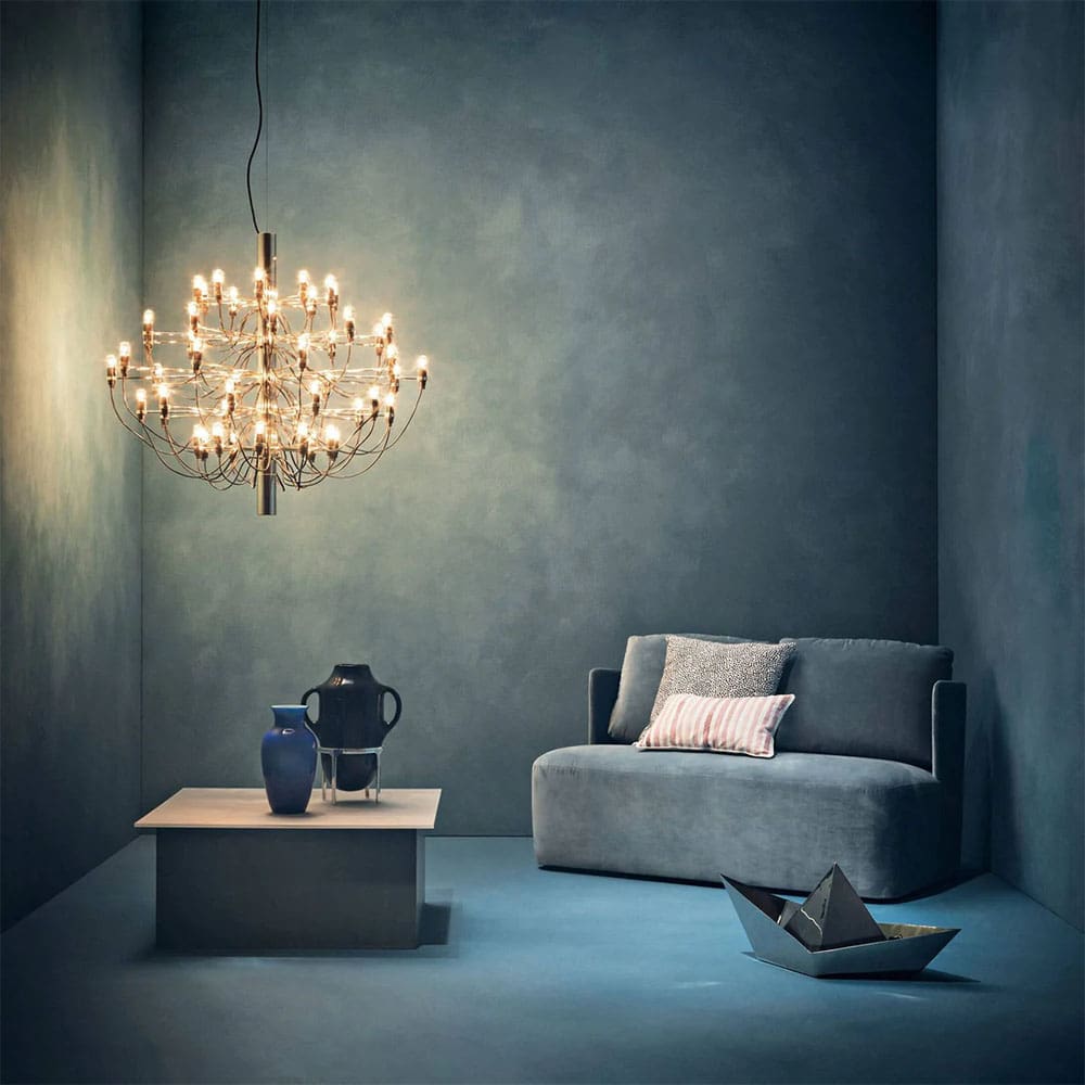 2097/50 is an iconic suspension chandelier, designed by Gino Sarfatti for Flos in 1958, and a timeless piece of contemporary design. Featuring a central iron structure and 50 brass arms, available in chrome, black, or gold finishes, this grand chandelier offers a modern take on the classic candelabra with an industrial yet refined aesthetic.