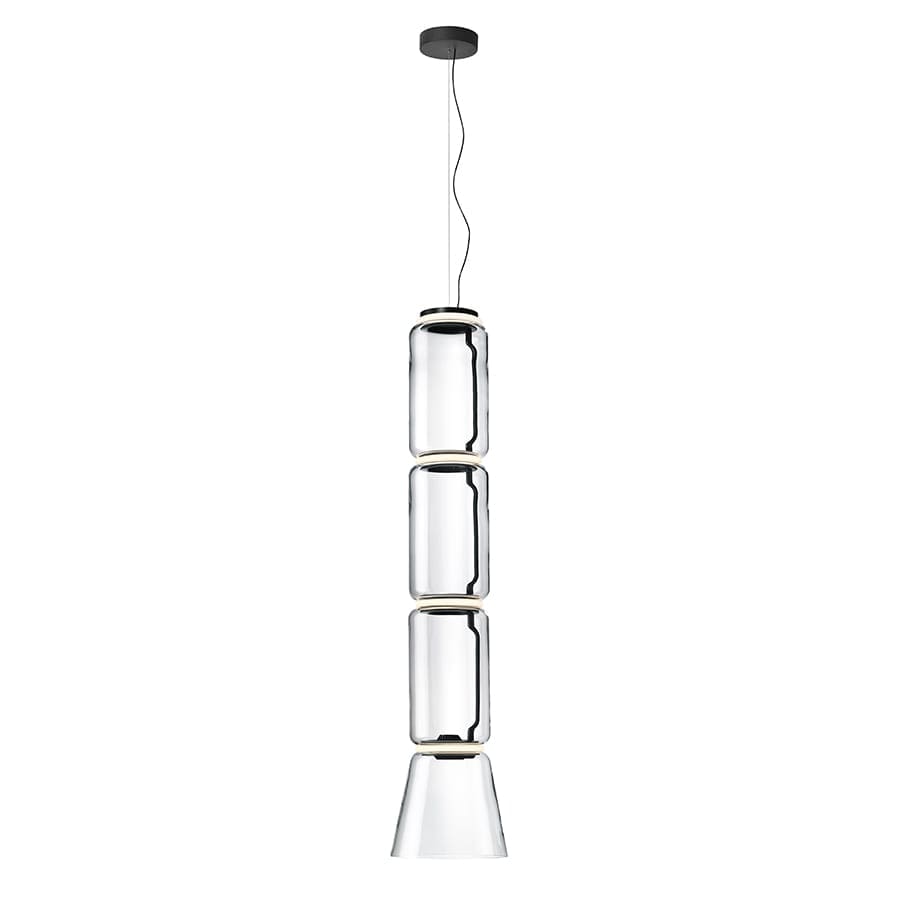 Suspension lamp composed of glass modules that connect to each other so as to reach a height of 3.2 meters (126.77″). The length of the power and suspension cable is 4 meters (157.48″). Cylindrical body and hemisphere in transparent blown glass, suspension attachment and rings in die-cast aluminum, internal lateral arm in hydroformed steel, and external ring diffusers in injection-molded opal optical silicone. The power supply located in the rose allows you to dimerize from 10% to 100% and vice versa with 0-10/1-10V, PUSH, DALI command.