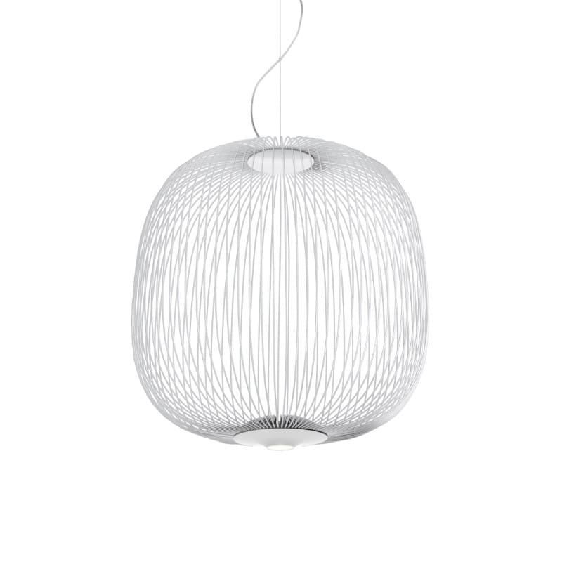 Spokes 2 Small by Foscarini, designed by Garcia Cumini, is a suspension lamp that embodies lightness and movement. Light filters through a magical geometric lattice, creating a mesmerizing interplay of voids and solids, while its shape evokes a lantern or birdcage. This collection offers great versatility with various shapes, sizes, and colors. The steel rods, powder-coated in matte finishes for white and black and liquid-coated for other colors, are attached at the top to ABS/polycarbonate disks and at the bottom to an aluminum module that houses and dissipates the LED boards. Power is delivered through two opposing rods, eliminating visible electrical cables and enhancing the lamp’s clean and contemporary design.