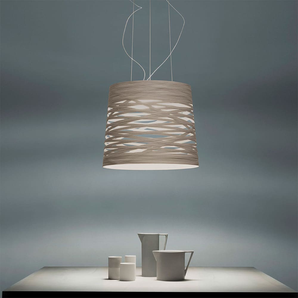 Tress Grande LED by Foscarini, designed by Marc Sadler, is a suspension lamp that plays with a magical weave of solid and empty spaces. Handcrafted by wrapping a composite ribbon on a fiberglass base, it creates a dynamic and enveloping visual effect. Available in various colors, Tress adapts to diverse interior styles. The large version features an internal acid-etched blown glass diffuser and an upper satin opaline glass screen, complemented by a chromed metal structure. Equipped with three stainless steel suspension cables, it provides both direct and diffused light. A kit for rosone decentralization and a multi-rosone system (up to 6 or 9 suspensions) is also available, enabling creative compositions. A contemporary icon, versatile and elegant.