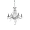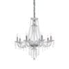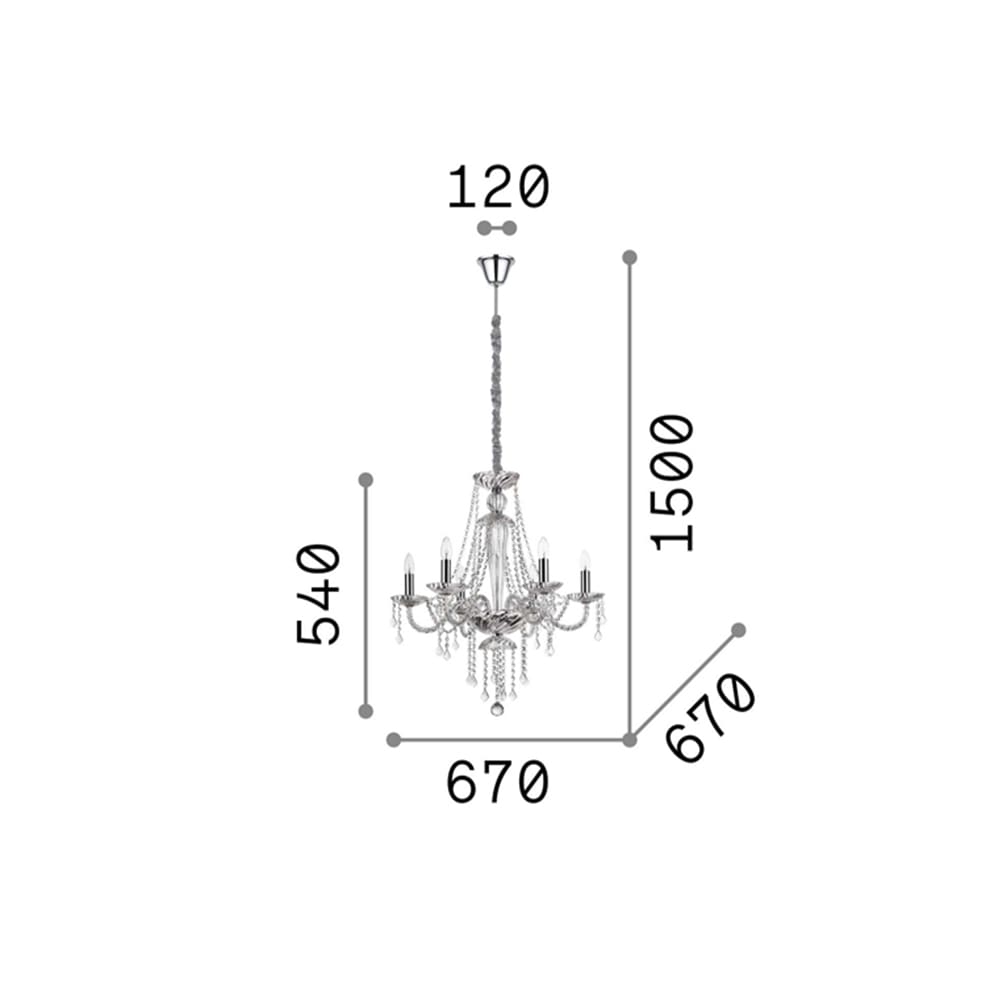 Amadeus SP6 pendant chandelier, from the Amadeus collection by Ideal-Lux, embodies classic elegance and craftsmanship. Its chromed metal frame, characterized by sinuous and refined lines, forms the basis of a design that harmoniously combines classic shapes and contemporary details. The decorative elements in blown glass and cut crystal, precisely arranged on the frame, give the chandelier a unique brightness and splendor. The combination of these meticulously selected materials creates a play of light and shadow, helping to diffuse an enveloping and sophisticated light into the surrounding environment. The velvet chain cover not only elegantly hides the support structure, but also adds a touch of luxury and warmth to the chandelier. Ideal for prestigious residential spaces or professional contexts that require a touch of refinement, this pendant chandelier stands out for its ability to elevate the surrounding environment through the fusion of fine materials and sophisticated design.