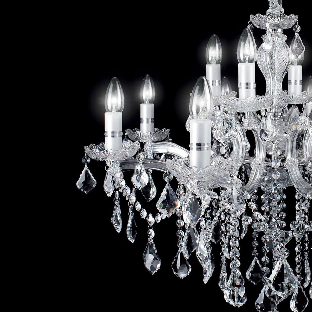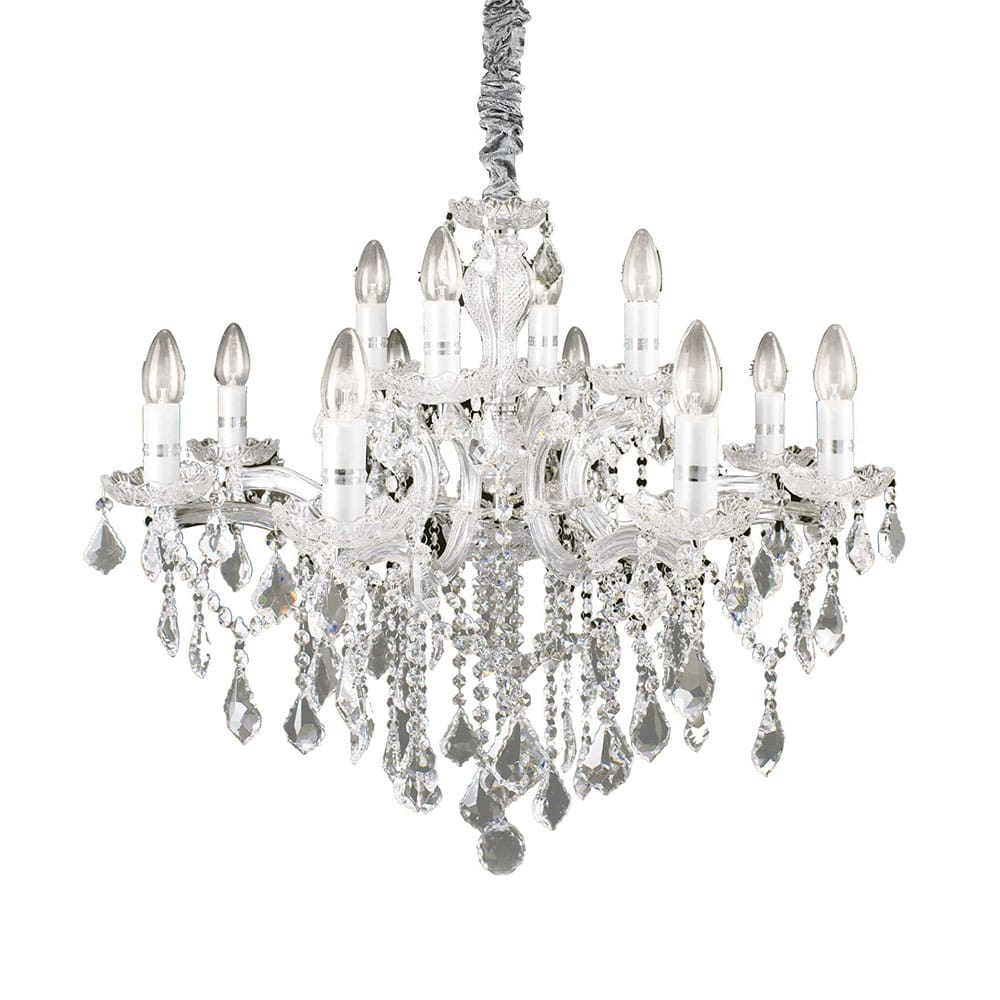 Florian SP12 chandelier from the Florian collection of the Ideal-Lux brand, an elegant and majestic lighting solution, ideal for illuminating interior environments with style and refinement. The metal frame of the lamp is enriched with decorative glass elements, which give a touch of elegance and luxury to the chandelier. The pendants are composed of octagons and final drops in cut crystal, which add brightness and brilliance to the lighting. The lamp is available in two versions: one with transparent glass and golden metal, and the other with transparent glass and chromed metal. These options allow you to choose the combination that best suits the style and decor of the environment in which it will be installed.