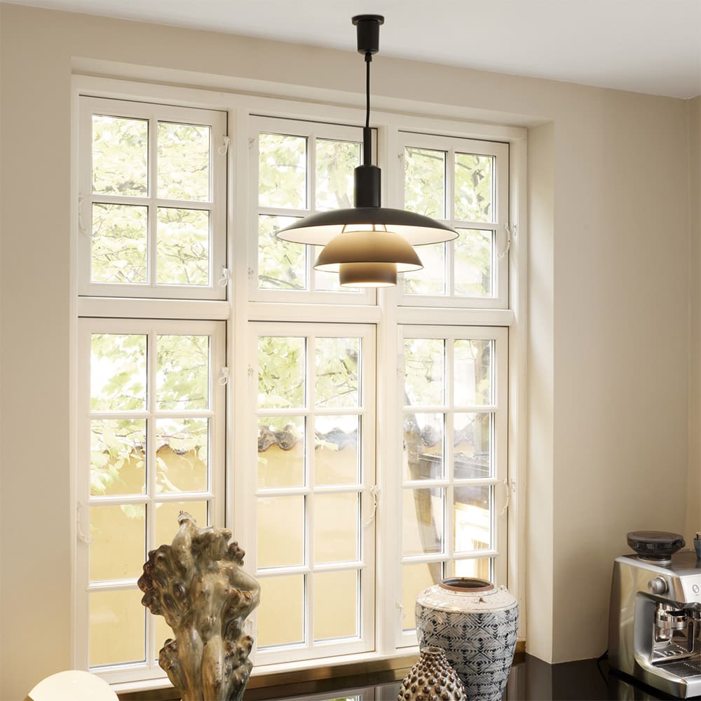 Poul Henningsen designed hundreds of lamps based on the three-shade system he developed in 1926 for unprecedented lighting quality that meets any need. Many of his lamp designs include a number that refers to the screen size of each particular fixture. The PH 5/5 is described as a “full” size suspension, characterized by its attractive compact appearance featuring an upper screen of approximately 50cm which corresponds to the central and lower screen in the 3:2:1 aspect ratio. PH’s ‘whole’ luminaires have been especially designed to be glare-free and can therefore be perfectly placed high up in a room where they combine great quality lighting with a welcoming ambience. The luminaire is available with white opal glass or soft touch black painted metal with white interior. The metal screens with white painted interiors reflect a subtle and mainly downward light, the upper metal screen combined with the central and lower screens in mouth-blown three-layer translucent opaline glass create a warm light around the suspension. The supplied frosted glass diffuser is easy to insert for even softer light distribution. Today, the signature lighting of Poul Henningsen’s full-sized PH 5/5 enhances contemporary interiors with its special touch of classic yet modern Danish elegance, or taking commercial spaces with high ceilings such as flagship stores to new heights, meeting rooms, restaurants, hotel rooms and lobbies.