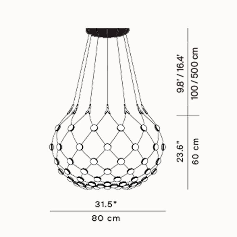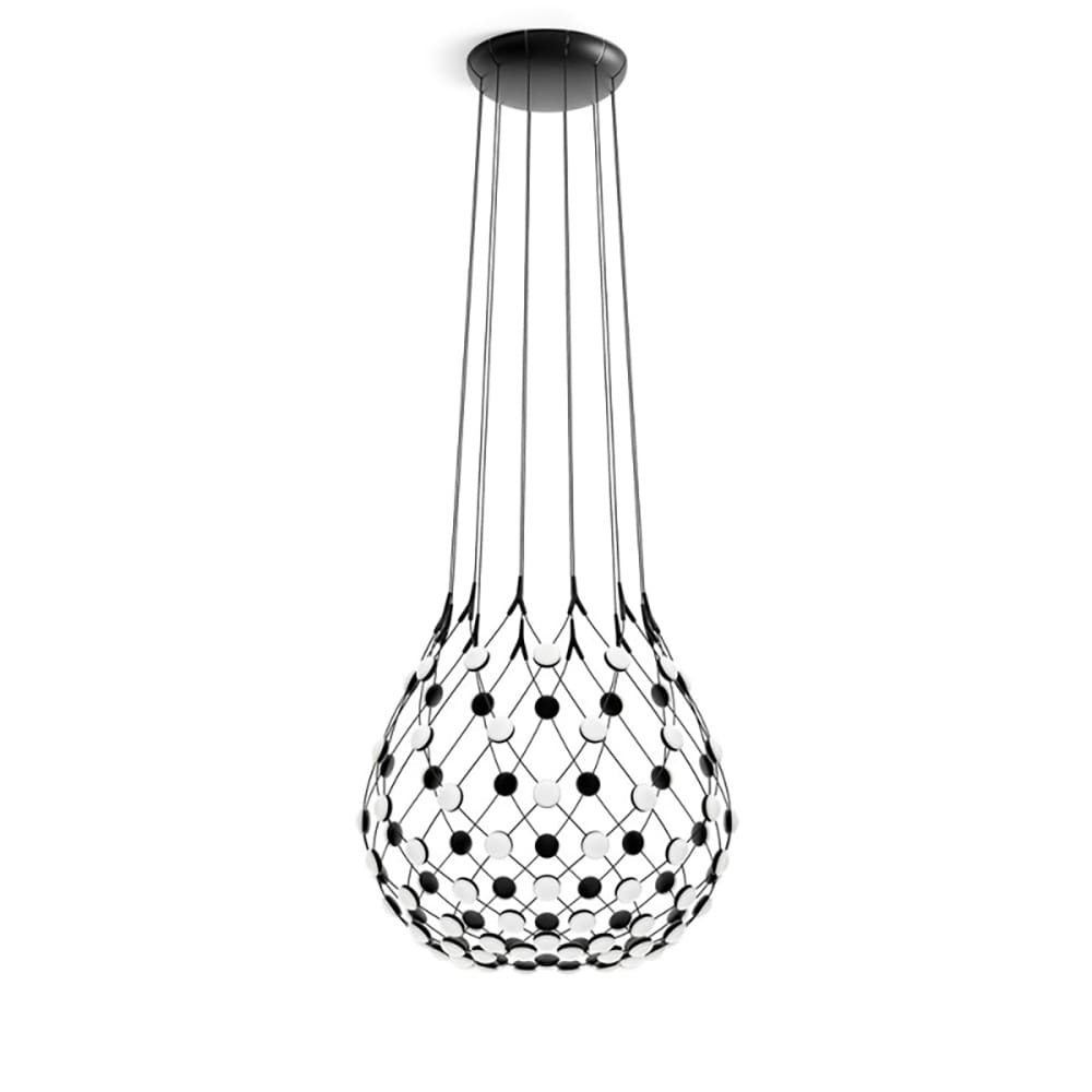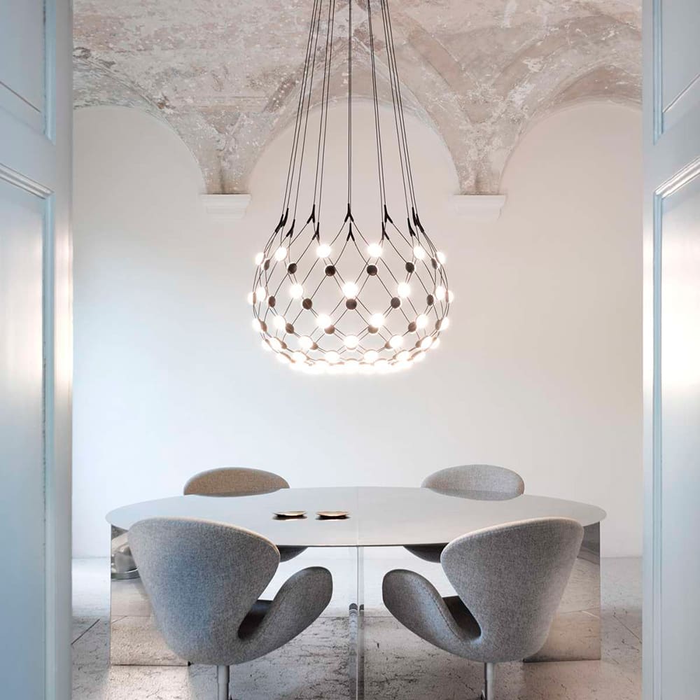 Mesh is a chandelier designed by Francisco Gomez Paz and produced by the Luceplan brand. A lamp with a strong scenographic impact, whose light, almost transparent structure, composed of a network of flexible cables at the intersection of which the LED sources are positioned, hides the complexities of the project and, dematerialising, leaves room only for the light, unique and true protagonist.