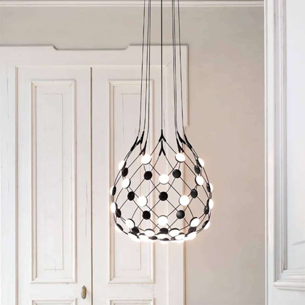 Mesh, the suspension lamp designed by Francisco Gomez Paz for Luceplan, blends iconic design with a strikingly scenic impact. Its lightweight, nearly transparent structure is made of a network of flexible cables, with LED sources positioned at their intersections, creating a uniform and captivating light distribution. This innovative concept, available in three sizes (55, 80, and 100 cm in diameter) and cable lengths ranging from 1 to 5 meters.