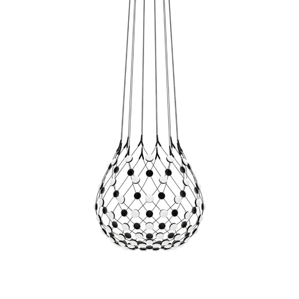 Mesh, the suspension lamp designed by Francisco Gomez Paz for Luceplan, blends iconic design with a strikingly scenic impact. Its lightweight, nearly transparent structure is made of a network of flexible cables, with LED sources positioned at their intersections, creating a uniform and captivating light distribution. This innovative concept, available in three sizes (55, 80, and 100 cm in diameter) and cable lengths ranging from 1 to 5 meters, dissolves the physical structure to highlight the light as the true star. Perfect for modern interiors, Mesh provides an elegant and functional lighting solution, ensuring optimal light distribution and adaptability to various spatial needs.