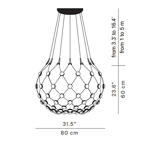 Light source: LED 53W – 2700K – CRI=90 – 220-240V – 220-240V – phase cut dimmer. Cable 5 m. Dimensions: Ø 80 cm H 60 cm
