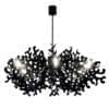 Coral is the pendant version with 8 lights that gives rise to the entire family, designed by VILLA TOSCA for the Lumen Center brand, while Coral P is the ceiling-mounted version with 6 lights. Made of lacquered metal, they are available in glossy black, glossy white, chartreuse green, red and gold leaf finishes. Diffusers made of white silk-screened Pyrex glass with coral pattern.