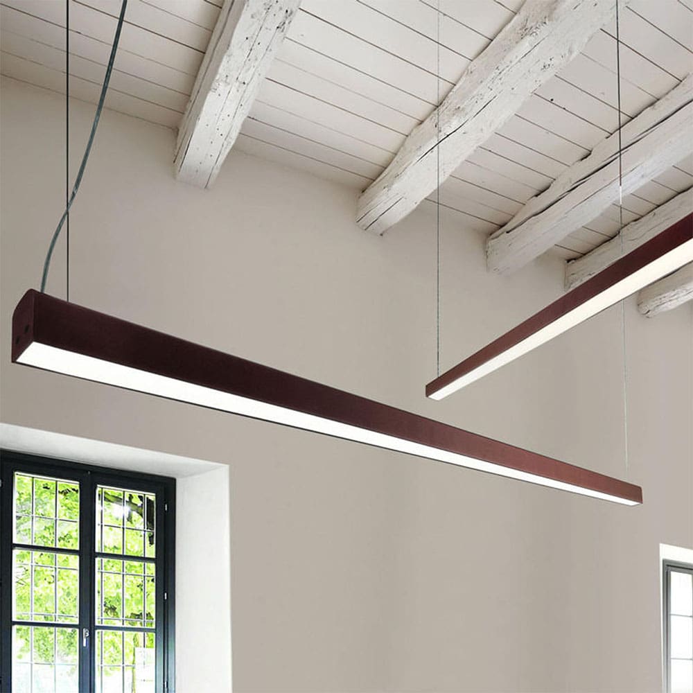 Ego L is a powerful suspension lamp, designed by VILLATOSCA and produced by the Lumen Center brand, of “industrial minimalism”. Available in three lengths: Ego L (135cm) – Ego XL (168cm) – Ego XXL (201cm). Opal white PMMA diffuser and direct light LED light source with FT white, FT black, FT corten and sandblasted aluminum finishes. Transparent power cable and TRIAC dimmable power supply included.