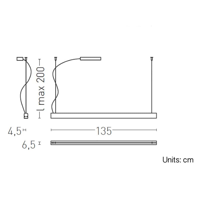Light source: LED SMD (included) – 28 w – 3000k – 220/240V o 110/120V – 3360 lumens – CRI>90 – IP20 – TRIAC dimmable . Dimensions: L 135 cm W 4.5 cm H 6.5 cm Ø canopy 26×7 cm