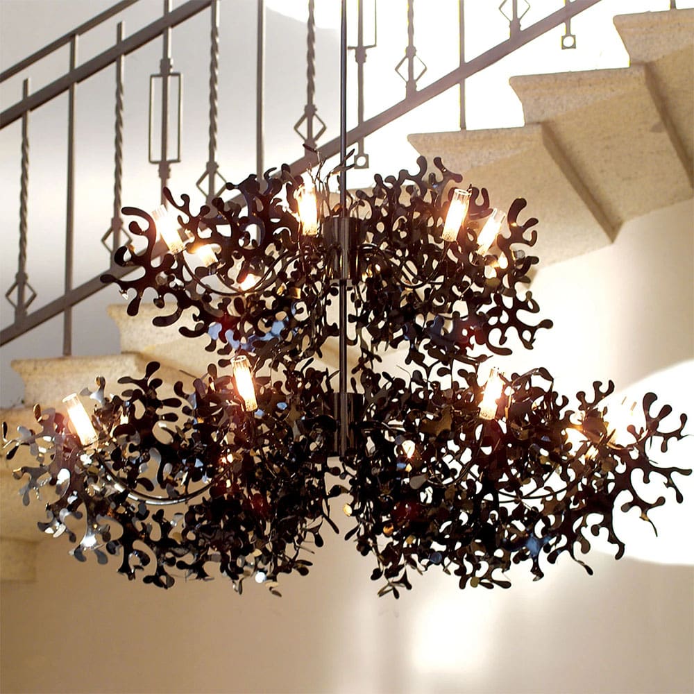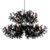 Supercoral is a large chandelier with a diameter of 140 cm available with 8 or 16 lights, designed by VILLATOSCA for the Lumen Center brand. Made of lacquered metal, available in glossy black, glossy white, chartreuse green, red and gold leaf finishes. Diffusers made of white silk-screened Pyrex glass with coral motif.