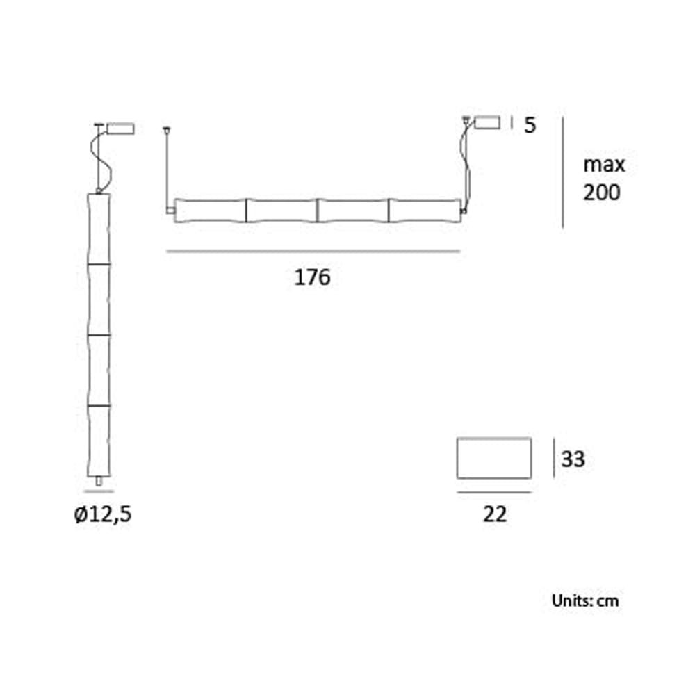 Sorgente luminosa: LED SMD – 64W – 3000K – 4400 lumen – CRI>90 – Driver elettronico: Controllo Bluetooth – Dimmer Incluso – IP 20. Dimensioni: L 176 cm Ø 12,5 cm H 200 cm