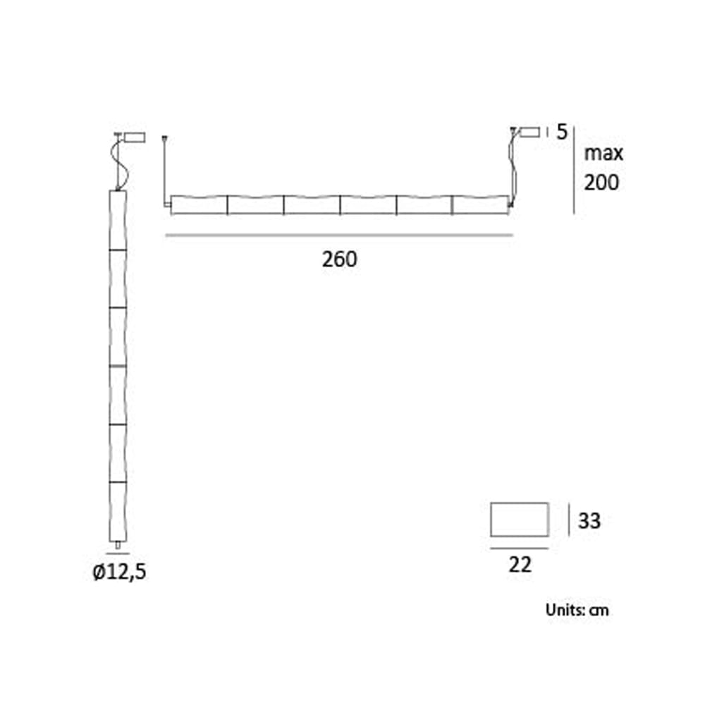 Sorgente luminosa: LED SMD – 96W – 3000K – 6600 lumen – CRI>90 – Driver elettronico: Controllo Bluetooth – Dimmer Incluso – IP 20. Dimensioni: L 260 cm Ø 12,5 cm H 200 cm