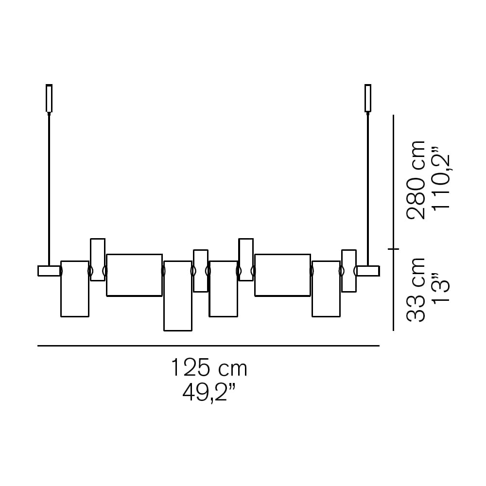 Light source: LED 1 x max 30W (bulb included) – 2700 K – 3300 lumens – CRI>85 + LED 1 x max 25W (bulb included) – 2700 K – 2750 lumens – CRI>85. Dimensions: L 125 cm H 33 cm