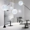 Globe is a collection of lamps designed and produced by the famous Tom Dixon brand. Available in different models and colors. Collection made in polycarbonate. In the continuous search for the purest forms, Globe stands out as the most minimal of the lot. A spherical sphere, highly mirrored and perfectly reflective during the day, when lit reveals a multiplicity of internal reflections from the integrated LED. Also available in a non-metallic opalescent finish.