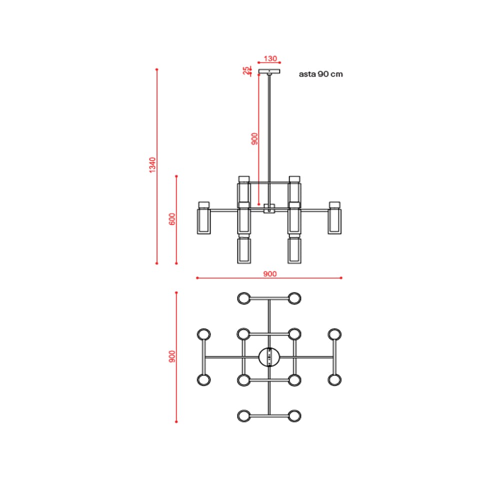 Light source: LED 16 x 8 W E14 (not included) – 500 lumens – 220/240 V – Dimmer according to the bulb – IP20. Dimensions: L 90 cm W 90 cm H 60 cm