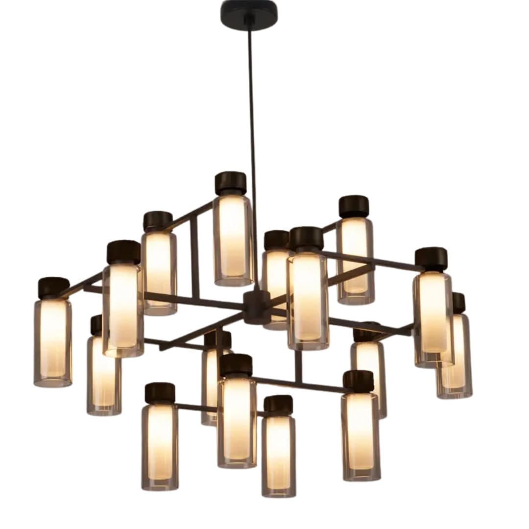 OSMAN 560.16 chandelier by Tooy, designed by Corrado Dotti, is part of the sophisticated Osman Collection. This family of lamps stands out with its rational design, enhanced by precious metallic details and double-walled cylindrical diffusers, providing captivating and harmonious lighting. The orthogonal structure, combined with perfectly balanced proportions, gives the OSMAN an avant-garde character while maintaining a familiar and refined formal aesthetic. Ideal for modern and sophisticated spaces, this chandelier enriches residential and commercial environments with a touch of contemporary design. The Osman collection is versatile and delivers high-quality lighting with a distinctive style.