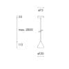 Light source: LED PAR16 – GU10 – 3000 K – 457 lumens – CRI=90 – 110–240 V – Phase-cut dim – IP20. Dimensions: H máx 2800 cm Ø 120 cm