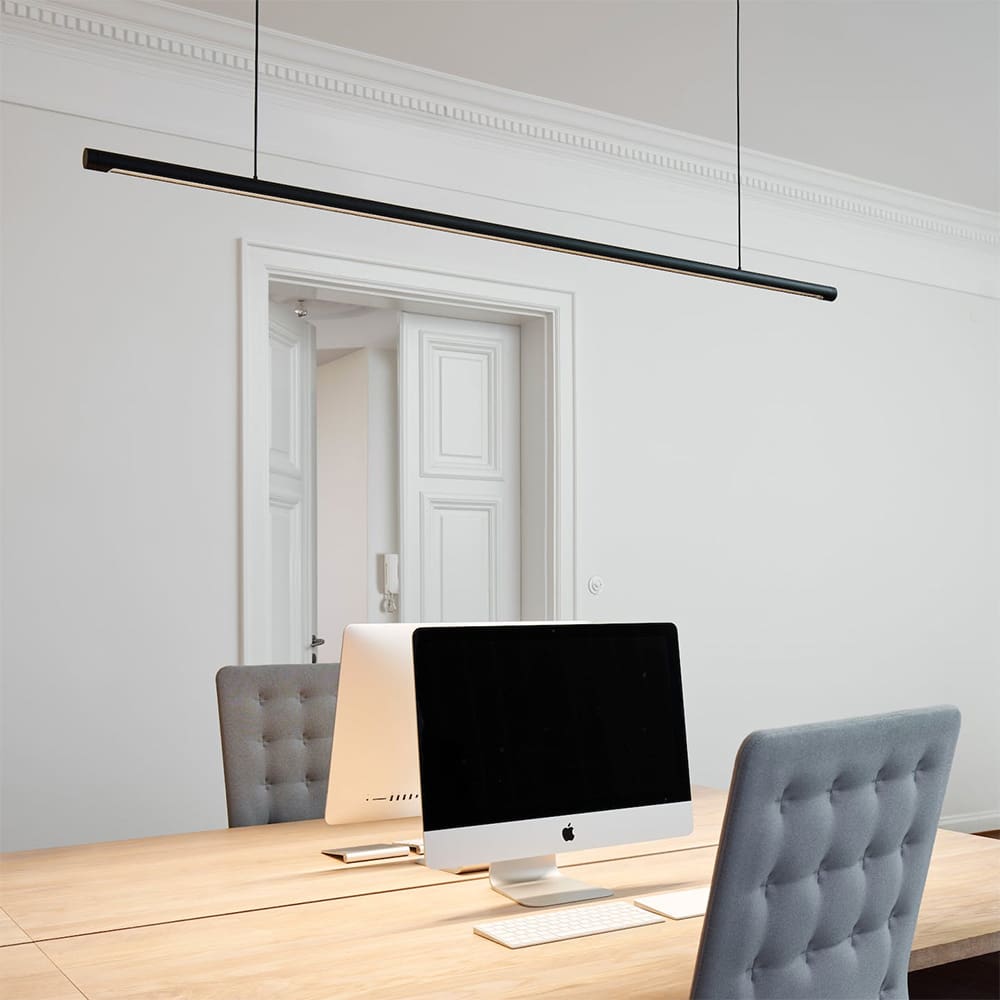 Designed by Dirk Winkel and produced by the Wästberg brand, w181 Linier resembles, at first glance, a linear suspension lamp. However, a closer look at its geometrically rigorous body reveals that there is much more than meets the eye. An array of 256 deeply recessed individual optical systems, ultra-durably packaged, provide direct, sharp light. For a smoother user experience, the w181 Linier is available with built-in blackout wheels on both ends; each can be rotated independently to set the desired light level, allowing for optimal adaptability.