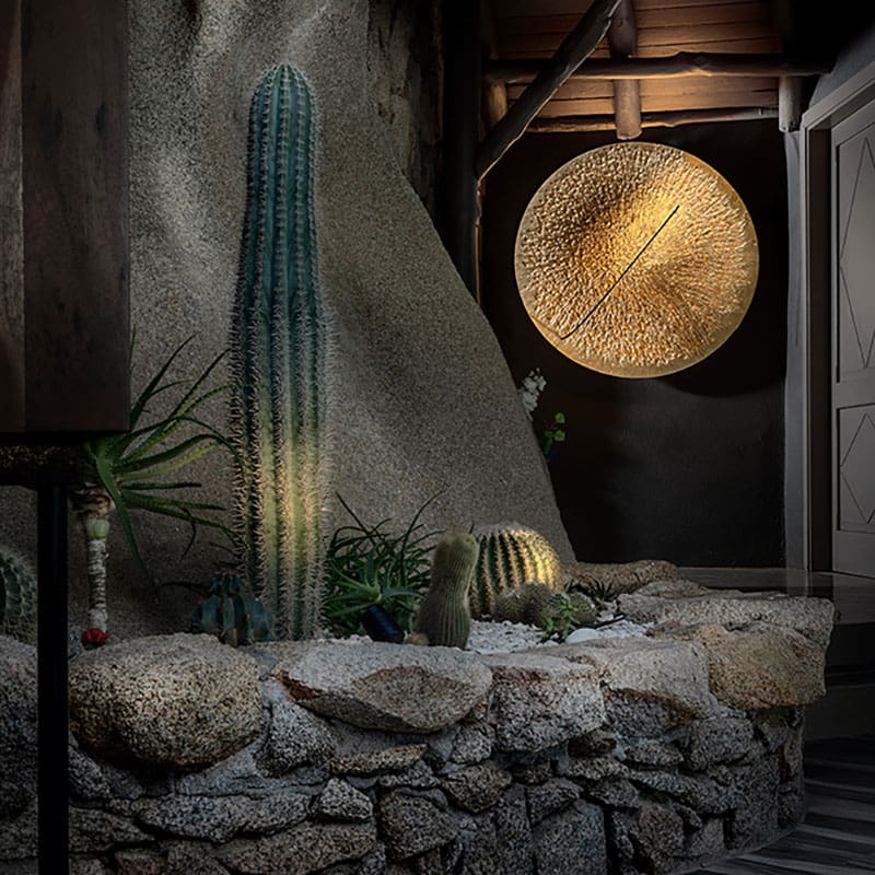 Bellatrix is a wall lamp by Catellani & Smith that transforms light into art through a striking golden disc with a diameter of 120 cm. Inspired by the star of the same name in the Orion constellation, this piece features a hand-textured surface finished with gold leaf. It is available in two versions: one with hand-drawn radial lines, and the other with swirling, centrifugal curves.
