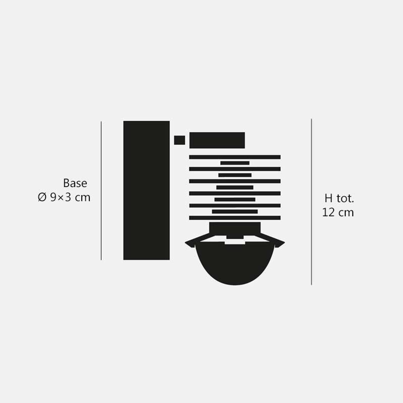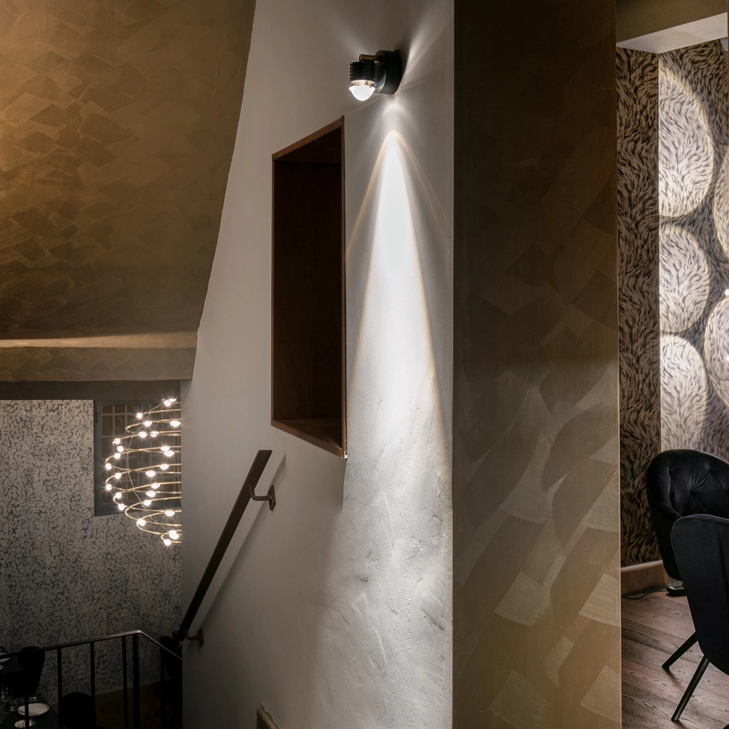 EC 301 is a wall lamp composed of a black base and structure with brass details.