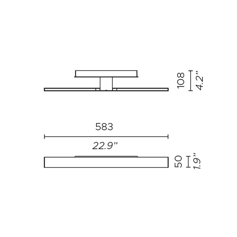Light source: 1 x 11,5W Strip LED – 1350 lumens – 2700 K – CRI>90 – 220/240 V – Phase-cut dimmer/Triac – IP44. Dimensions: H 50 mm L 583 mm W 108 mm