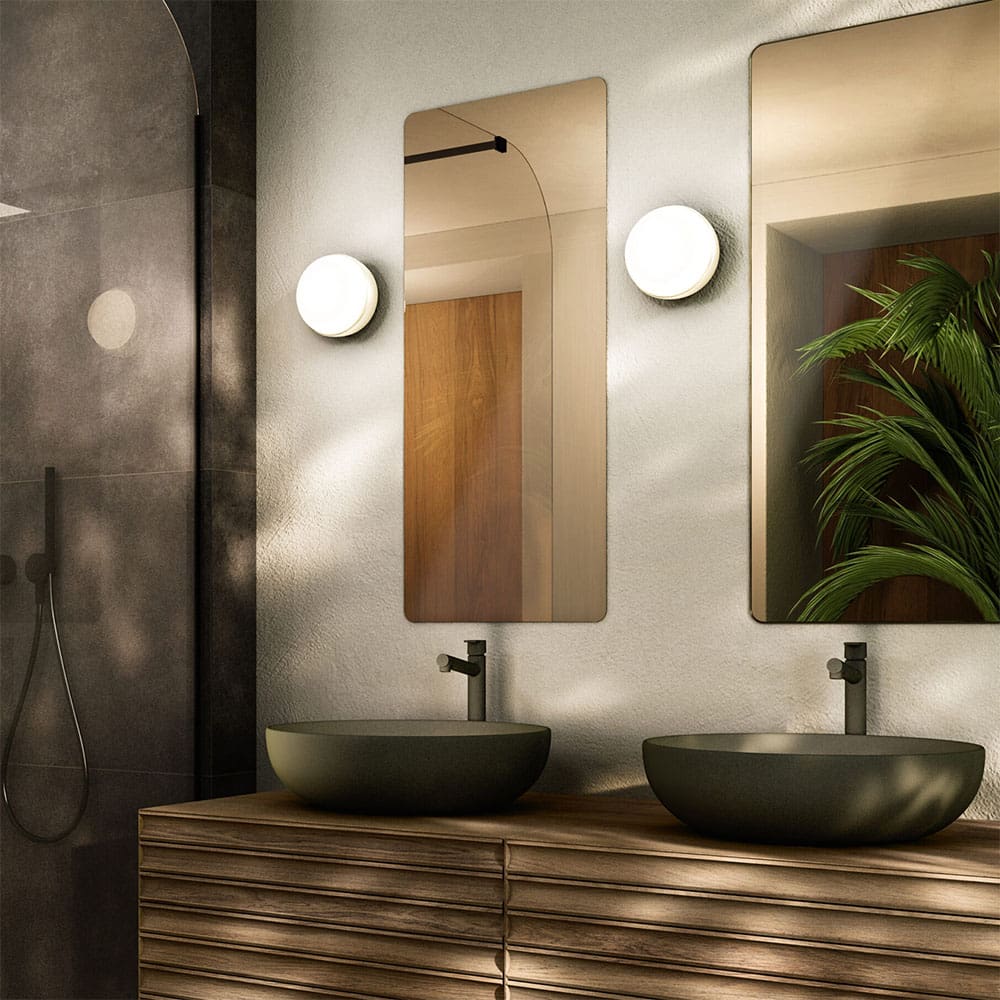 Light source: 1 x 5W Custom LED – 435 lumens – 2700 K – CRI>90 – 220/240 V – Phase-cut dimmer/Triac – IP44. Dimensions: W 100 mm Ø 150 mm