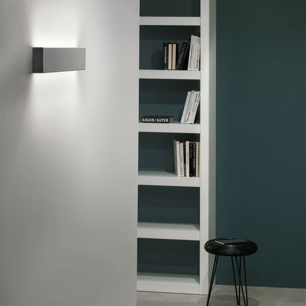 Box W is a family of wall lamps with a variety of finishes, sizes and emissions. Painted metal frame. Slits of intense light appear on the walls: Box W is a wall lamp with a square shape and minimal design. The new black, real brushed brass and real brushed copper finishes are added to the classic white and cement colours. Diffuser in satin polymethylmethacrylate.