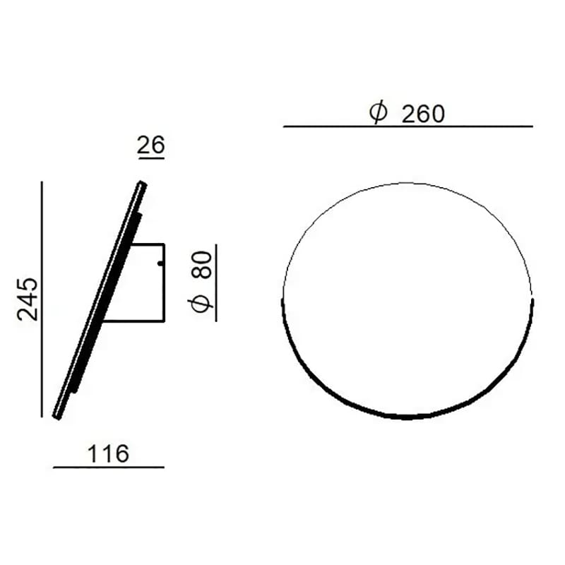 Light source: 72 topLED 18 W DC – 19 W AC – 3000K – 220-240V – 2094 lumens – IP40 – CRI90. Dimensions: Ø 260 mm