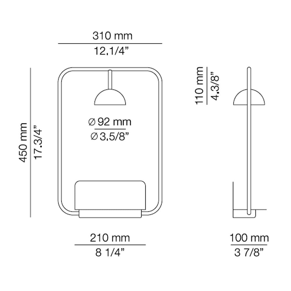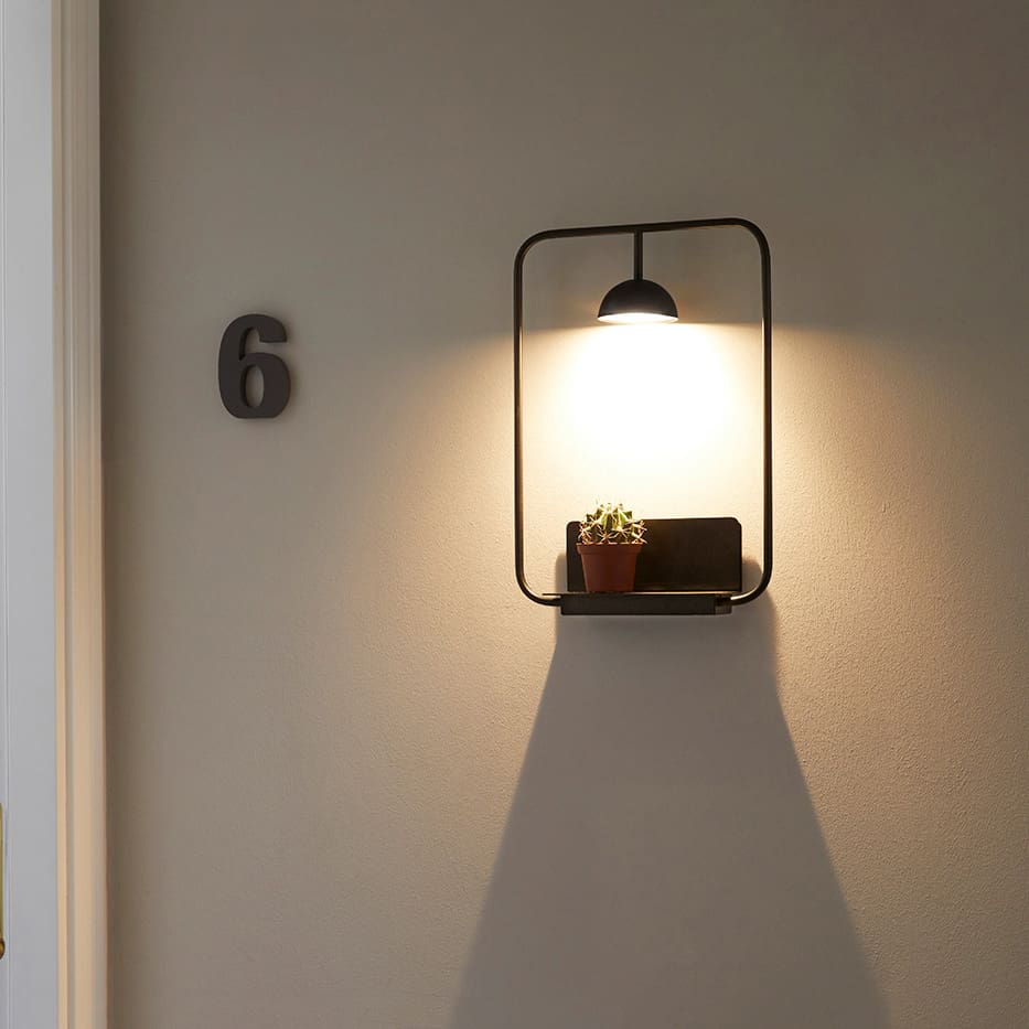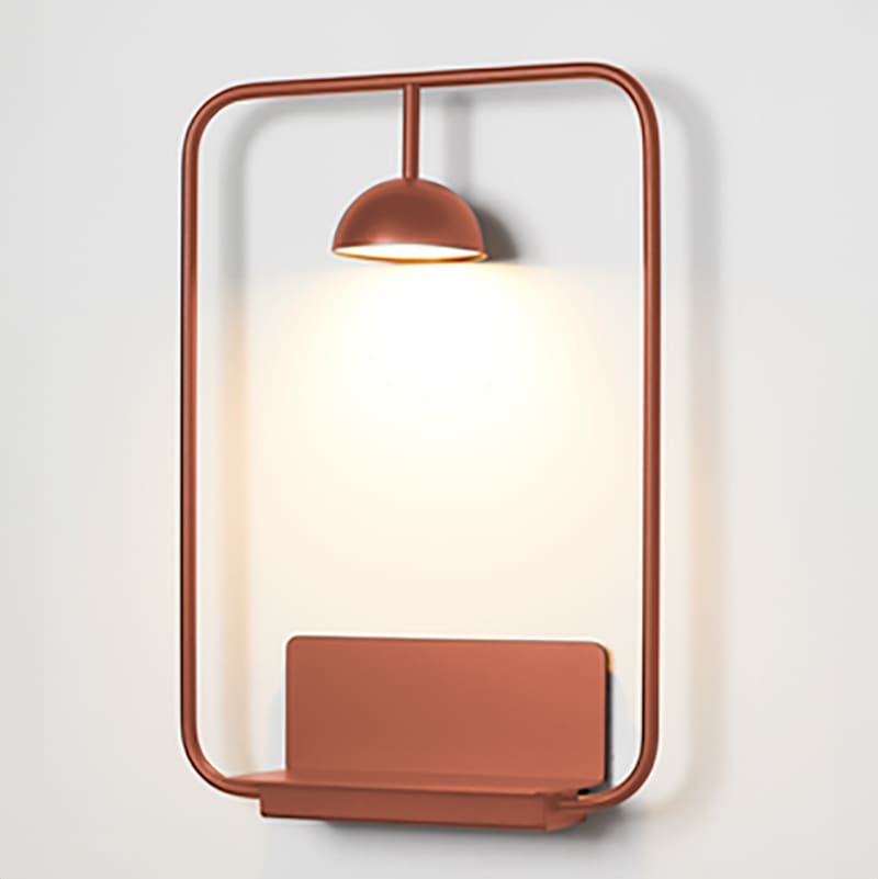 Wall lamp with rectangular body with rounded edges. Head with dome lampshade and integrated LED. It has a shelf that supports up to 2 kg of weight. Cupolina is available as a floor lamp, table lamp, applique and suspension, all sharing the same common element, a small dome from which the light escapes. It can be combined with various metal structures to adapt it to any space and any need. The rounded lines of Cupolina are always proportionate and balanced, creating elegant and versatile lamps, designed to enrich the space in which they are placed. All models are available in white, black and terracotta.