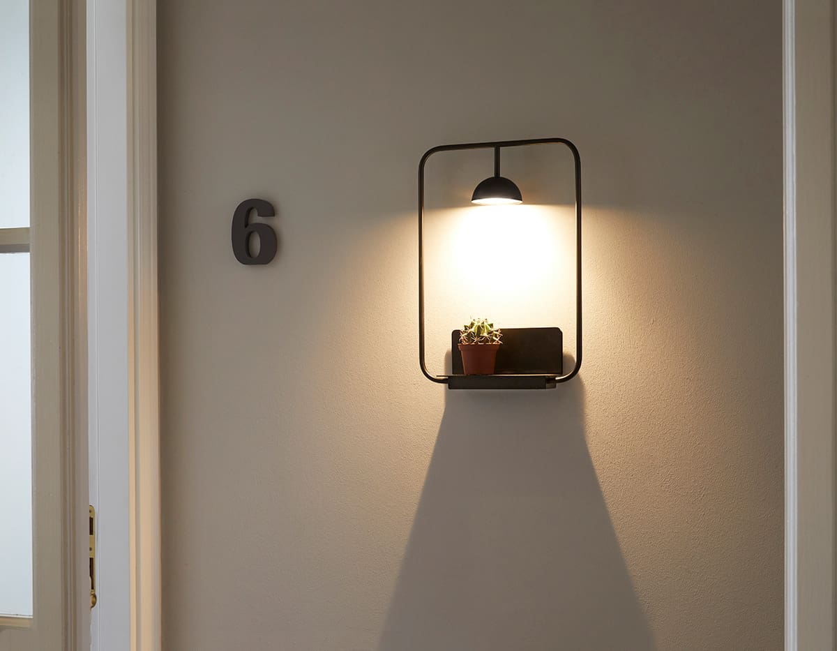 Wall lamp with rectangular body with rounded edges. Head with dome lampshade and integrated LED. It has a shelf that supports up to 2 kg of weight.
