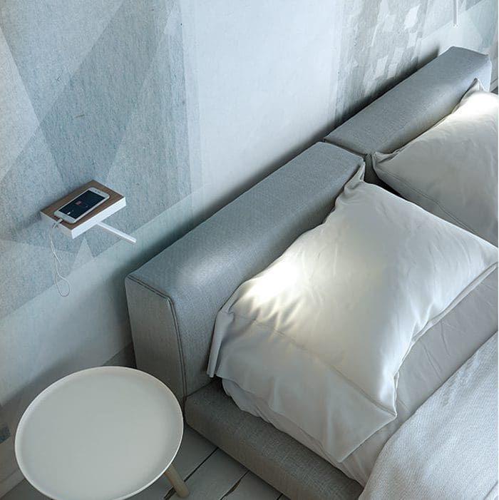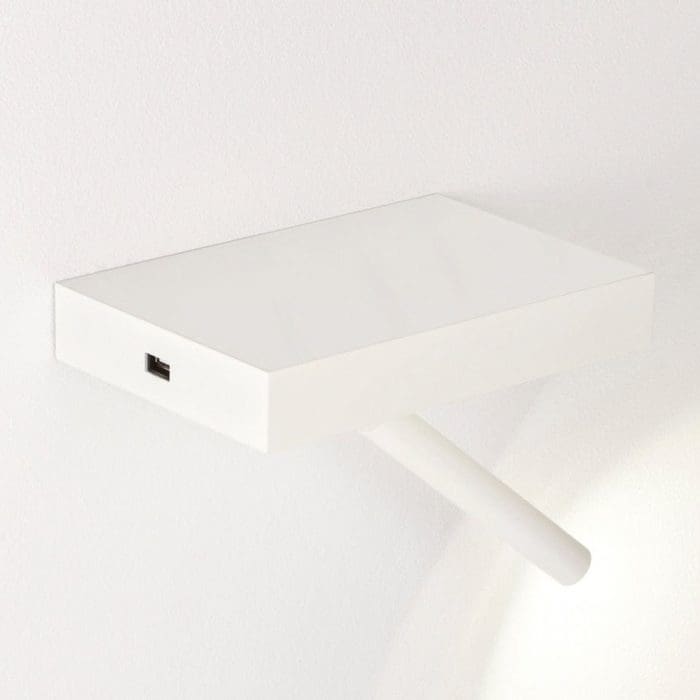 Nit is a suggestive wall lamp designed by the designer Crous Calogero and produced by the famous Estiluz brand. Multi-tasking: a swivel arm reading light with wooden shelf and integrated USB charger. Metal wall light with wooden shelf and 2 Amp USB charger. On / off switch at the bottom of the shelf.