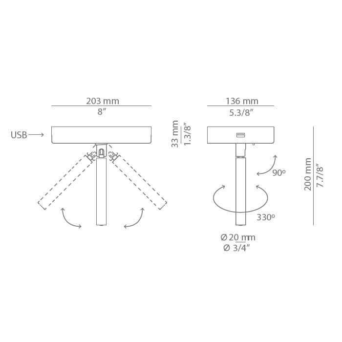 Light source: LED 1W 3000K – Ang. 60º – CRI80 – 350mA – 100V/240V – Typ 96 lumens – On / off switch – USB charger from 2 A – Low ripple – Dimension: L. 20,3 cm – P. 13,3 cm – H. 20 cm