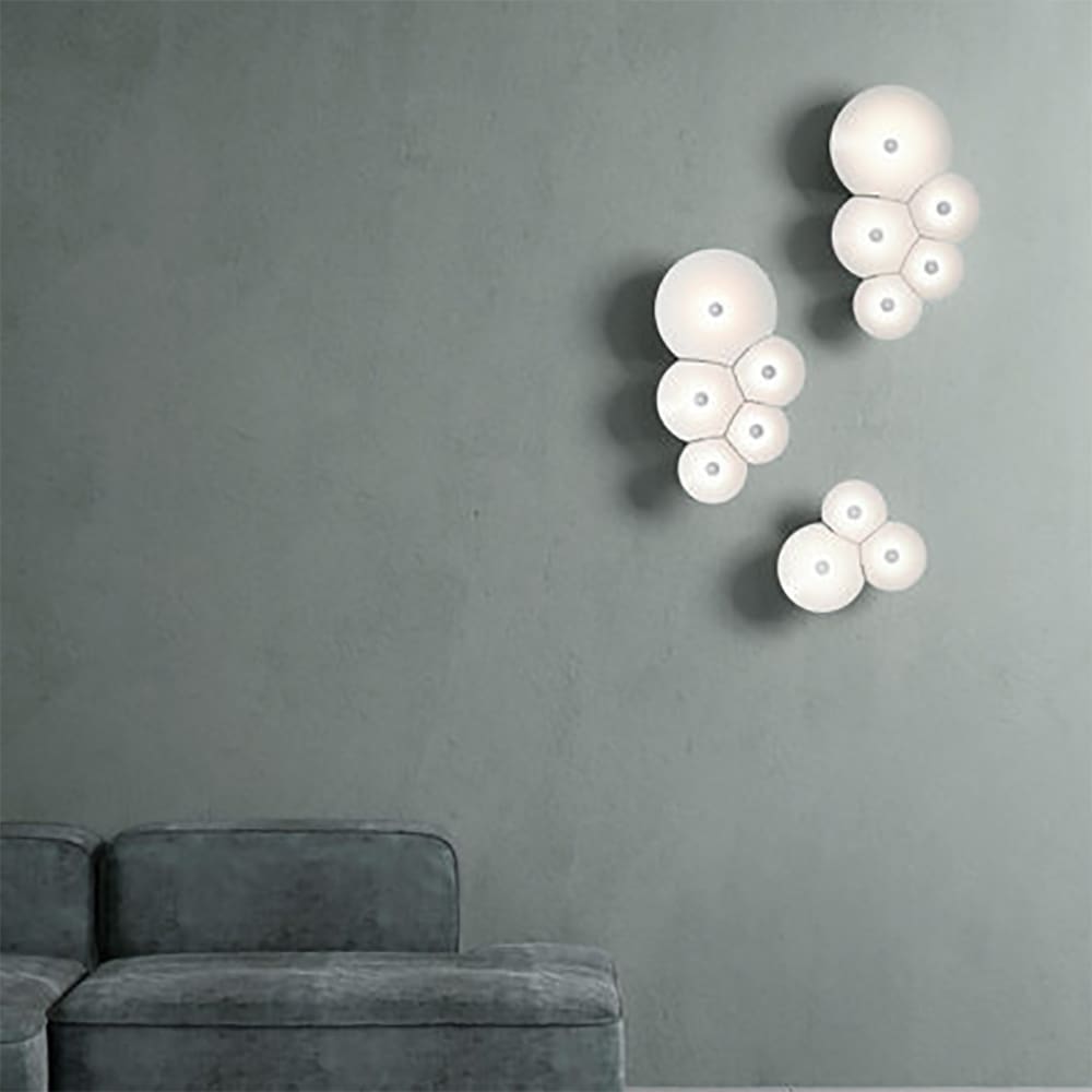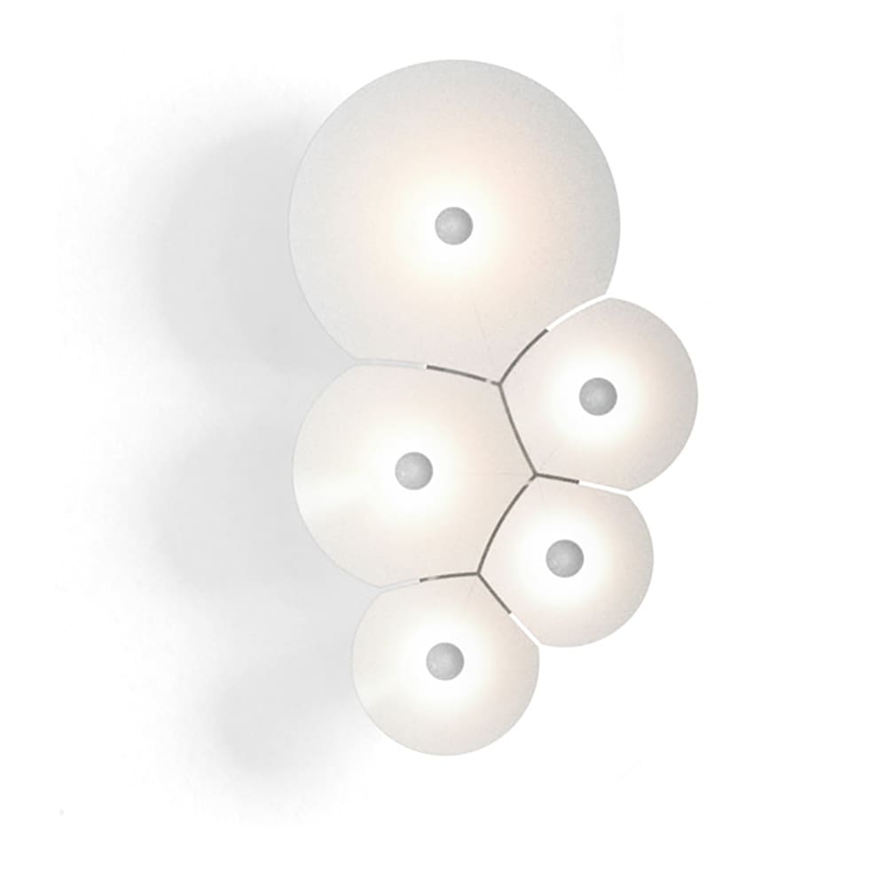 Bulbullia, designed by Francisco Gomez Paz for Luceplan, is a wall or ceiling lamp inspired by the delicate geometry of soap bubbles. This harmonious composition of wide, flat conical parabolas creates a captivating visual effect. Available in 3-body and 5-body versions, each element is crafted from white polycarbonate, slightly curved to achieve a lightweight and dynamic structure. At the center of each “bubble,” an integrated dimmable LED light source emits a soft, ambient glow, reflecting inside the cone to create a warm and elegant lighting effect. Bulbullia is the perfect decorative and architectural lighting solution for modern and sophisticated spaces, blending innovation, aesthetics, and functionality into a single, striking design piece.