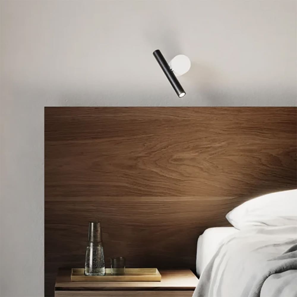 The Doi lamp by Luceplan, designed by Meneghello Paolelli, merges essential design with functional versatility. It features two distinct elements: a cylindrical base anchored to the wall or ceiling and an 18 cm LED spotlight crafted from extruded aluminum. A mechanical joint allows the light to rotate and move along the base, enabling upward or downward lighting. Ideal as a reading lamp near a headboard or for illuminating corridors, walls, or art pieces, Doi seamlessly fits into any setting. Inspired by the primary shapes of a circle and a line, it comes in sophisticated finishes such as matte black, matte white, gold, and combinations of black and white. A perfect lighting solution for modern and minimalist spaces.