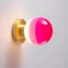 Dipping Light Wall by Marset, designed by Jordi Canudas, is a wall lamp that blends art and lighting in a unique design piece. Made from hand-blown glass, it features concentric layers of paint that diffuse light, creating a mesmerizing gradient effect. Its spherical diffuser, available in various colors, doubles as a refined decorative object when turned off. The metal body and base, available in brushed brass or graphite, enhance its sophisticated aesthetic. The lamp is available in two configurations: one for horizontal lighting and another for vertical lighting, offering customization and flexibility. Each piece is one-of-a-kind, thanks to its handcrafted production. Ideal for residential and commercial spaces seeking an elegant and atmospheric lighting solution.