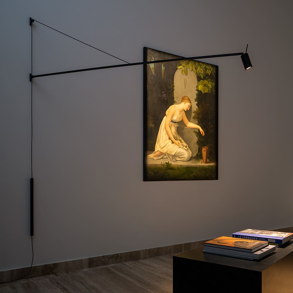 SWAN is a lamp designed by Bernhard Osann and produced by the Nemo brand. A graphic sign, essential lines that accentuate the great flexibility of movement and functionality of the Swan lamp. A productive intuition and a sophisticated mechanism make the lamp arm extendable from 134cm to 184cm, maintaining the linearity and composure of the design. The adjustable light source offers precise and punctual lighting. The counterweight, an essential part of the design, is covered in Testa di Moro leather.
