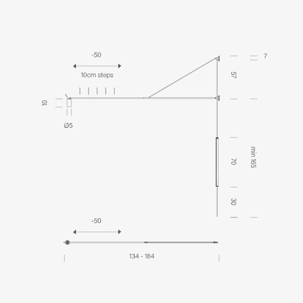 Light source: LED 15W – 2700K – 839 lumens – CRI=90 – 110-240V – Dimmable on cable – IP20. Dimensions: L 184 cm H min. 165 cm