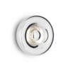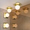 Plane is a vast collection of lamps designed and produced by the famous Tom Dixon brand. A brass plated chandelier composed of four double layered white glass spheres spread across four tiers.
