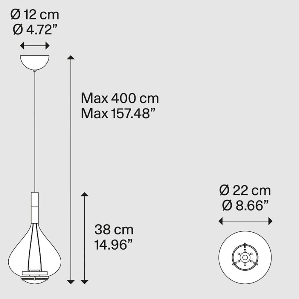 Light source: LED 20W – 2700K – 1815 lumens – CRI=95 – 220-240V – Dimmer TRIAC – IP20. Dimensions: H Max 400 cm Ø 22 cm