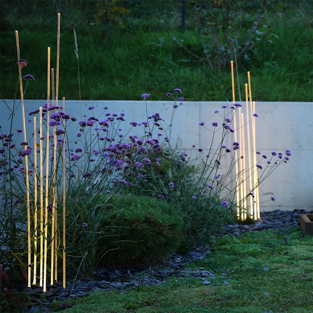 Reeds is a diffused light floor lighting fixture that uses monochromatic LED sources. Designed by Klaus Begasse for the Artemide brand, Reeds is available with IP20 protection ratings for indoors, IP67 and IP68 for outdoors. The IP67 and IP68 versions are available in Single or Triple form. The light spreads through 7 PMMA rods with different heights to give the impression of a reed thicket and which can be screwed to the base thanks to AISI 316 stainless steel bushes. Part of the light spreads on the ground also around the base itself. The base, of irregular shape, is designed to allow the “mosaic” joint with other devices in order to create an articulated composition as desired. Consisting of a base made up of a transparent polycarbonate casing mounted between 2 AISI316 stainless steel plates tightened with AISI316 stainless steel screws. Water tightness is guaranteed by a silicone gasket. The appliance can be fixed to the ground thanks to the holes inserted in the lower plate. Aesthetic technopolymer cover. Complete with integrated power supply and supplied with 1.5 m of H05RN-F 2×1 cable equipped with IP67 connector for electrical connection to the mains, suitable for cables with a diameter of 5-13.5mm.