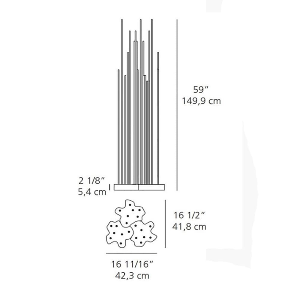 Reeds is a diffused light floor lighting fixture that uses monochromatic LED sources. Designed by Klaus Begasse for the Artemide brand, Reeds is available with IP20 protection ratings for indoors, IP67 and IP68 for outdoors. The IP67 and IP68 versions are available in Single or Triple form. The light spreads through 7 PMMA rods with different heights to give the impression of a reed thicket and which can be screwed to the base thanks to AISI 316 stainless steel bushes. Part of the light spreads on the ground also around the base itself. The base, of irregular shape, is designed to allow the “mosaic” joint with other devices in order to create an articulated composition as desired.
