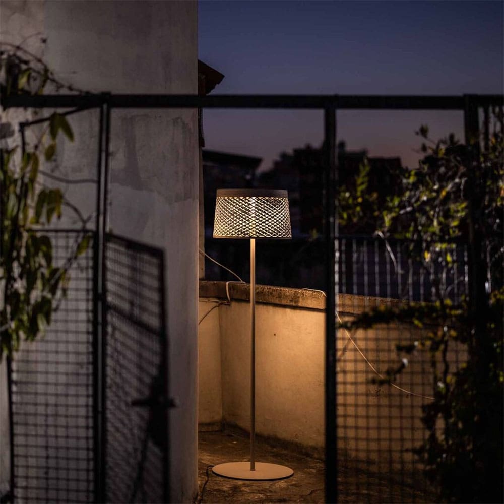 Twiggy Grid Reading by Foscarini, designed by Marc Sadler, combines formal lightness and durability, making it perfect for both indoor and outdoor use. The diffuser, crafted from woven composite material strips, is manually molded and hand-painted. The edges feature additional strips, completing the intricate design. At the center, a laser-engraved transparent PMMA plate captures and diffuses the light emitted by multi-chip LEDs, housed on an aluminum structure that acts as a heat sink. A further opal PMMA disc ensures soft, shielded illumination. The slim stem and circular base, made of polyester powder-coated metal, provide excellent resistance to UV rays and weather conditions. Twiggy Grid delivers downward-directed light and is the perfect blend of style, innovation, and functionality.