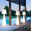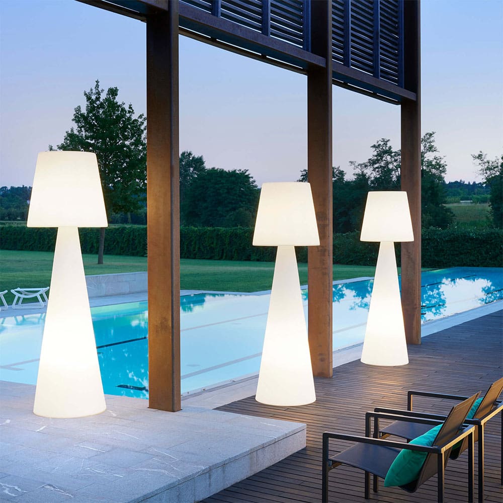 Thanks to the collaboration with Carlo Constantini, the Pivot floor lamp was born. Pivot is perfect for indoor and outdoor settings with an elegant and essential style: a garden, a terrace, an outdoor area, but also the interior of a home. Its design comes from the perfect combination of the conical shape of the base and the classic flared lampshade. The arabesque texture in relief on the lampshade enriches the floor lamp. An outdoor fixing base is also available and in different sizes. Thanks to its lightness, Pivot is easy to move, so it can be positioned in environments where it is necessary to quickly change the context according to needs. To make its movement even easier, Pivot is also available in the wireless version, thanks to the possibility of mounting two Candy Light modules instead of the bulbs.