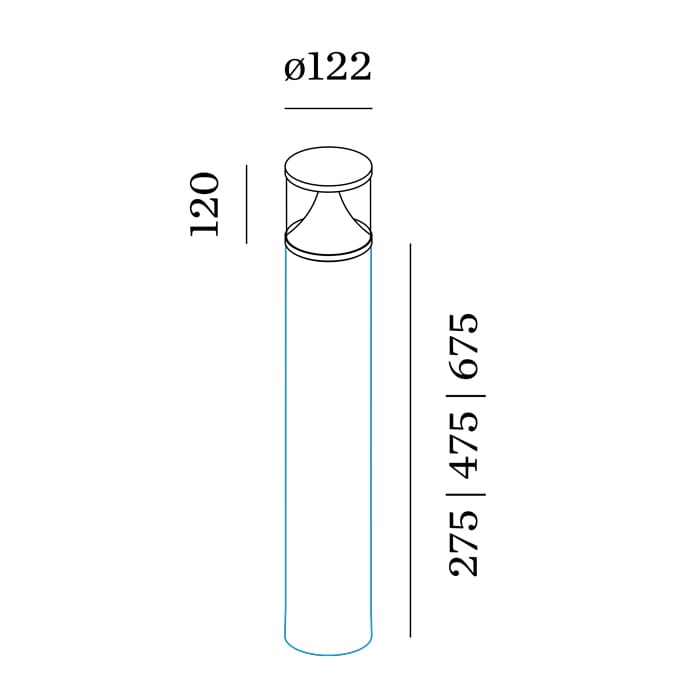 Light source: LED PCB 8W 3000k – IP65 – CRI ≥ 80 – 220 – 240 V – phase cut dimmer. Dimensions: Ø 122mm H 675mm